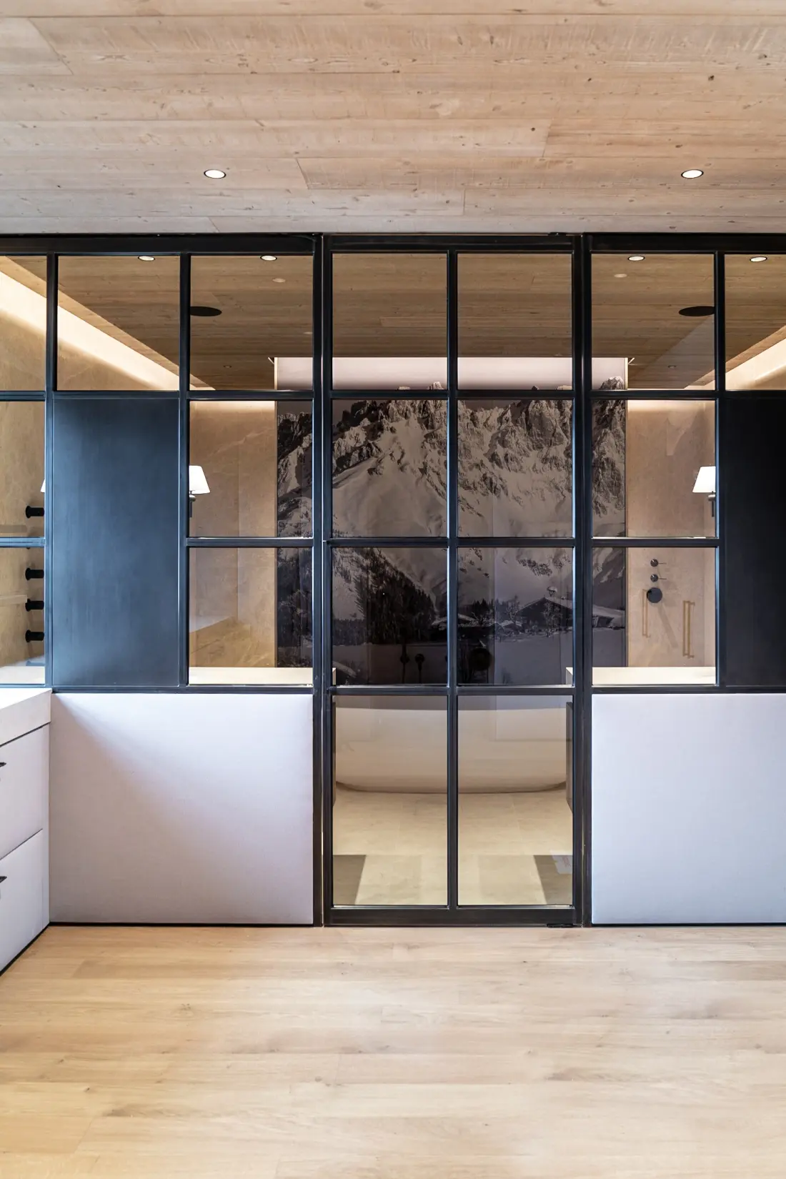 Brünierter, gewachster Stahl verbindet elegantes Design und Funktionalität: Eine hochwertige Stahl-Glaswand im Bad mit integrierter Spiegelhalterung trifft auf edle Weinkeller-Regale und maßgeschneiderte Stahlelemente unter der Treppe. Individuelle Lösungen für Interiors mit Charakter.