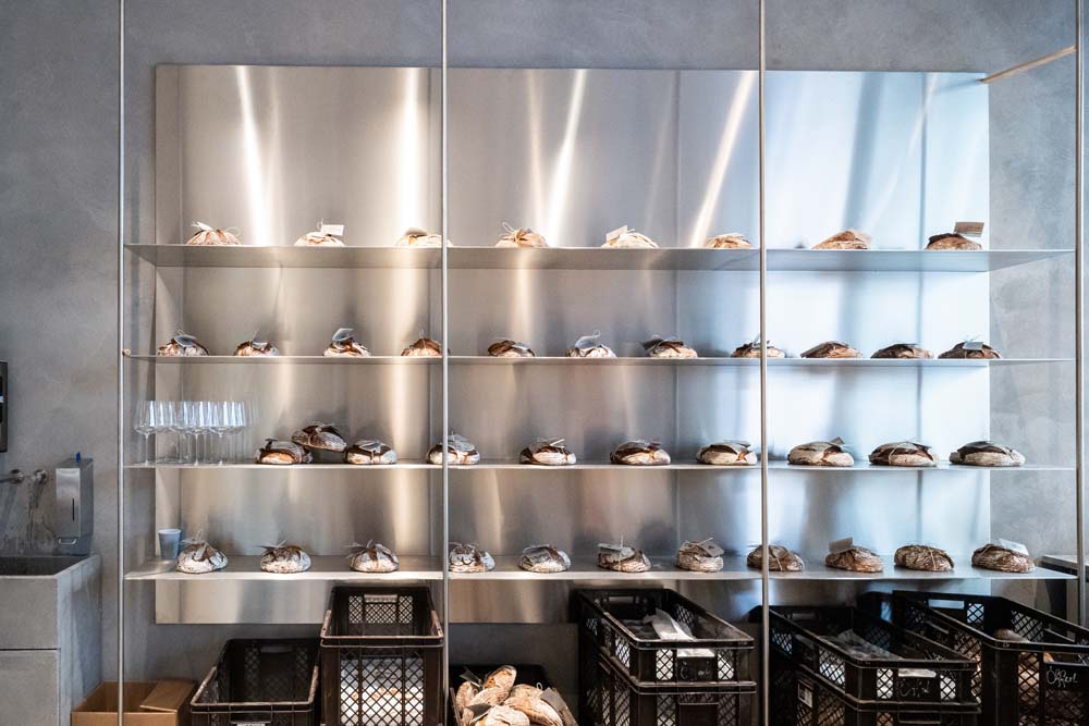 Maßgefertigte Edelstahl-Regale und Präsentationselemente für die Bäckerei Öfferl betonen handwerkliche Qualität. Präzise Metallgestaltung trifft Funktionalität – ein klares Designstatement für traditionelles Bäckerhandwerk mit modernem Flair.